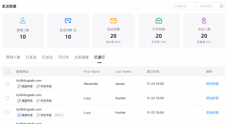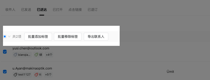 ●  一键打标:根据收件人的打开、点击、退订行为,快速标记不同用户类别。